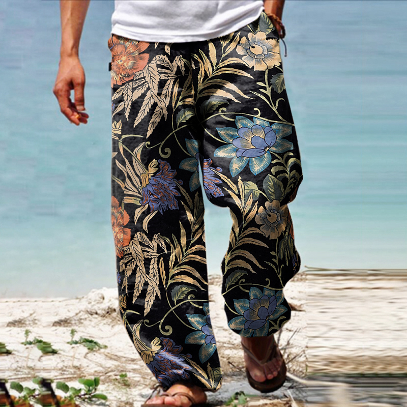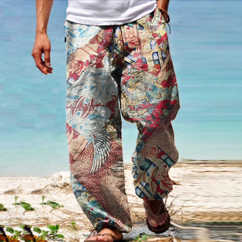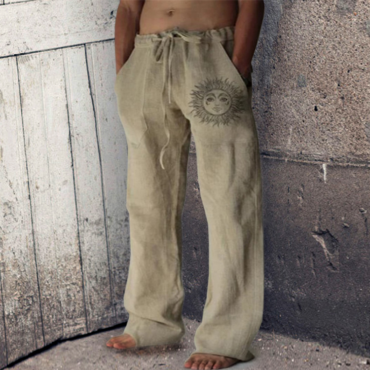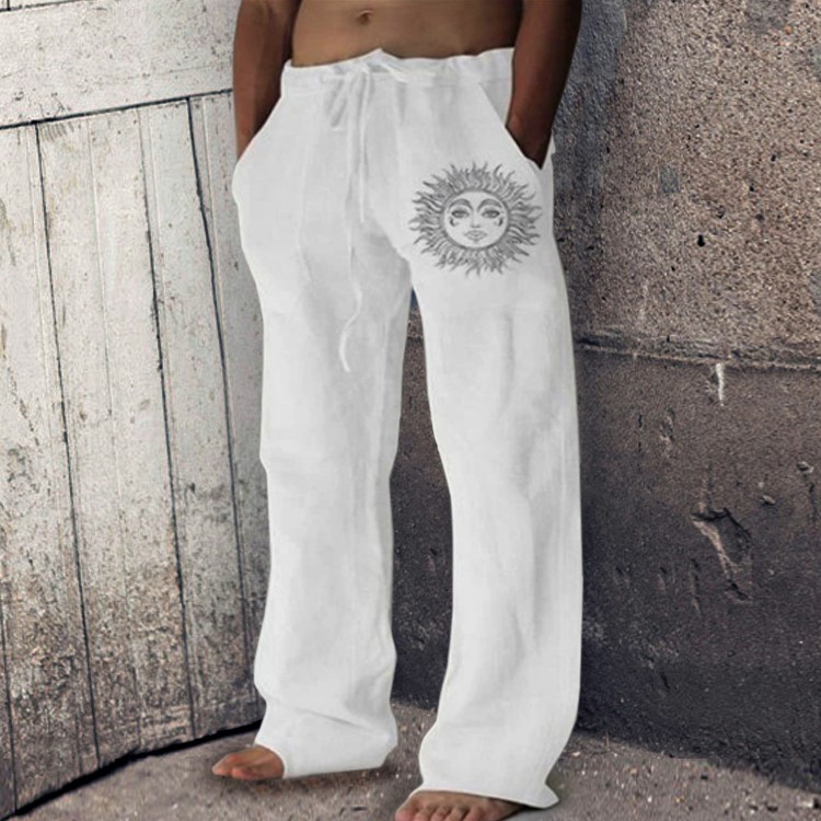 Men's Printed Loose Straight Cotton Linen Drawstring Casual Pants