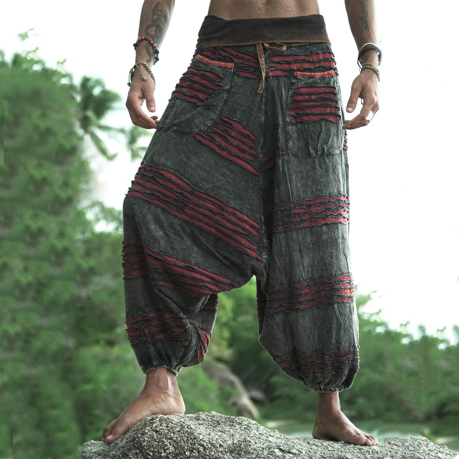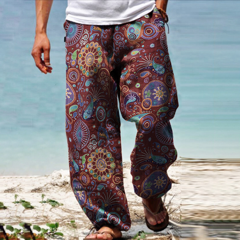 Men's Linen Western Ethnic Irregular Boho Print Double Pocket Stretch Loose Pants