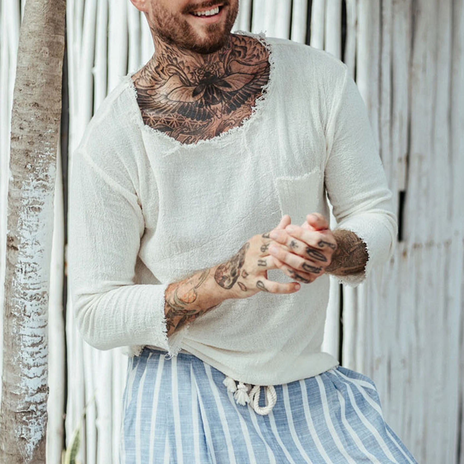 Mens Linen Minimalist Holiday Round Neck Long Sleeve Shirt