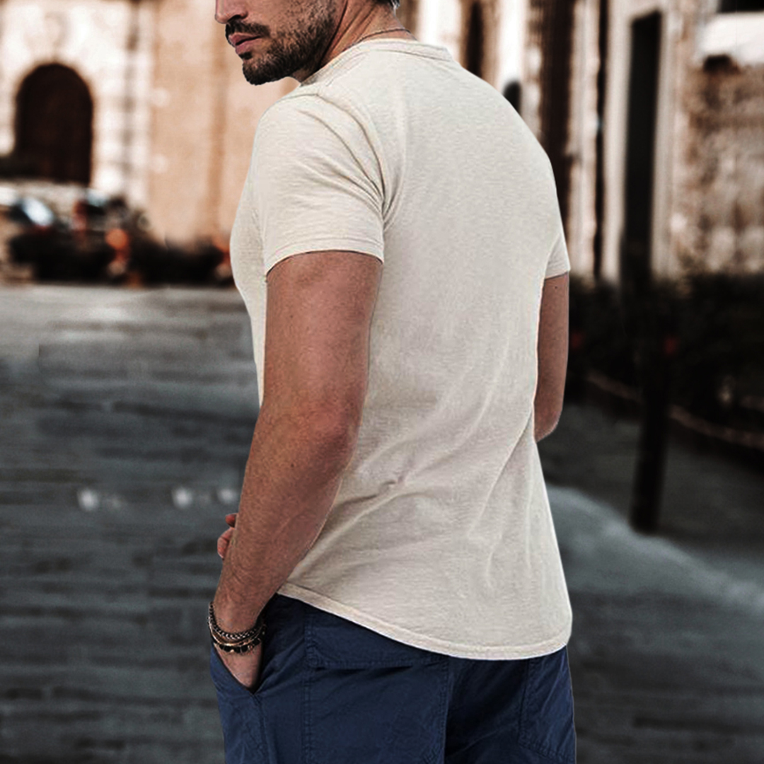 • Men's Solid Cotton Linen Henley Collar Casual Slim Fit Stretch T-Shirt