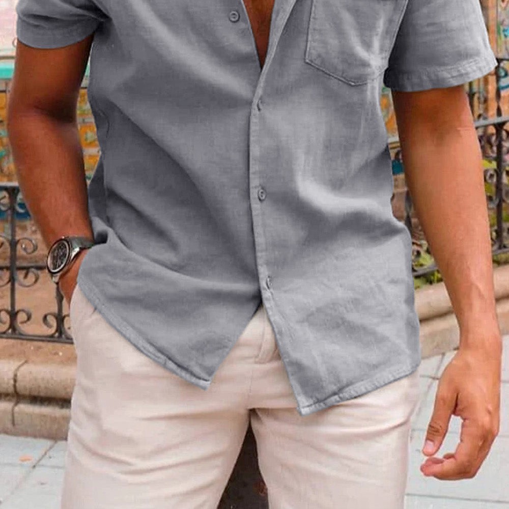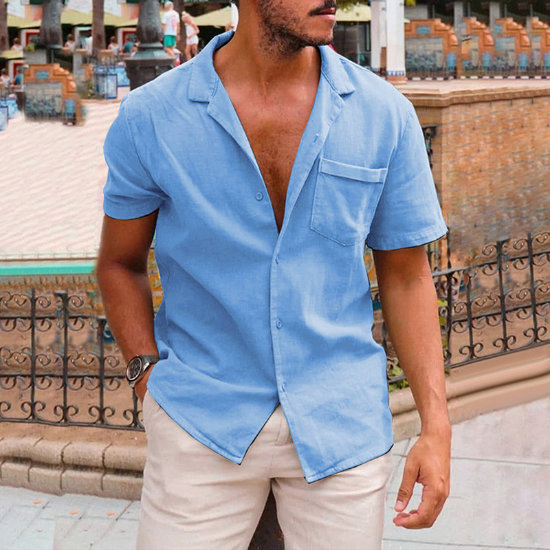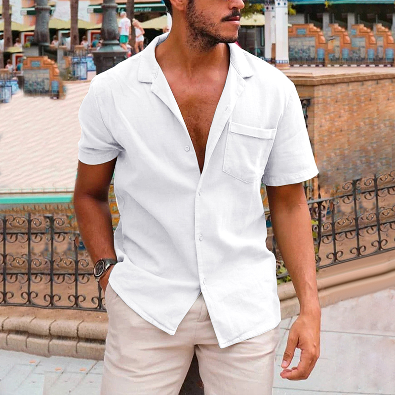• Men's Breathable Solid Color Short Sleeve Loose Cotton Shirt