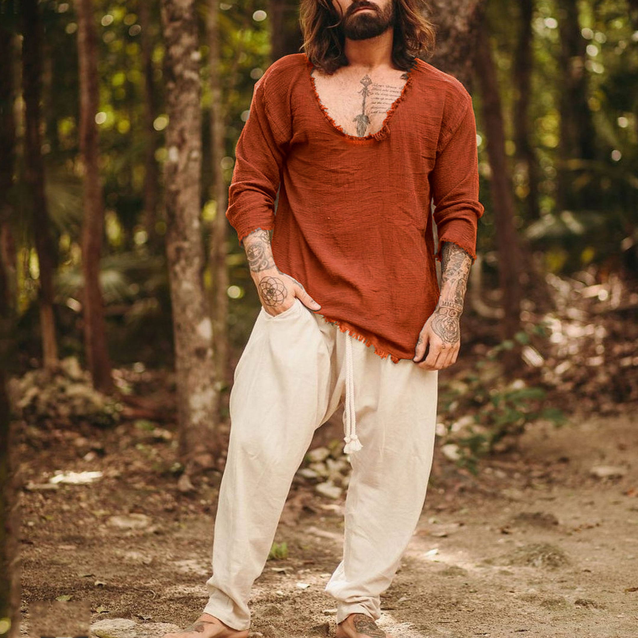 • Men's Linen Round Neck Plain Long Sleeve Shirt