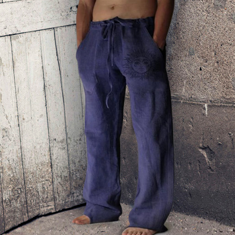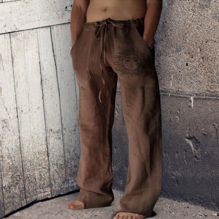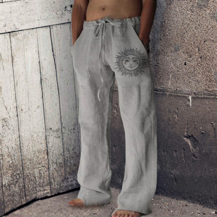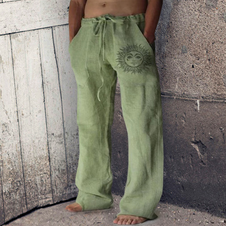 • Men's Printed Loose Straight Cotton Linen Drawstring Casual Pants